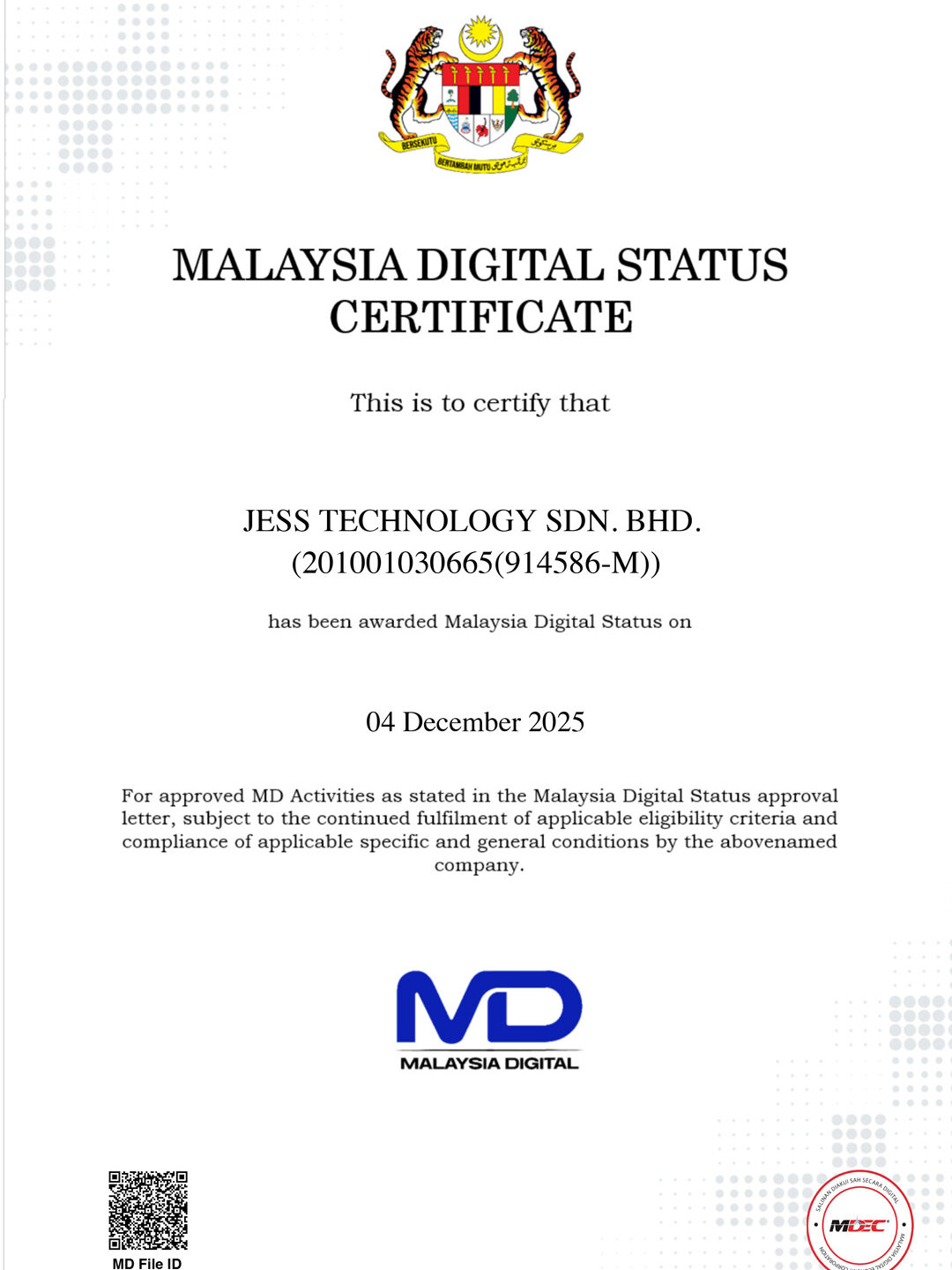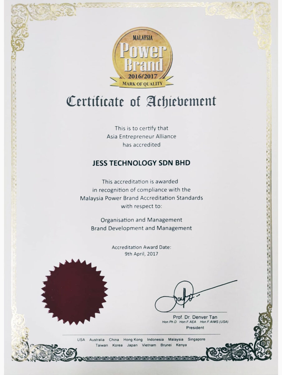 JESS Technology has been awarded Malaysia Power Brand in recognition of compliance with the Malaysia Power Brand Accreditation Standards.