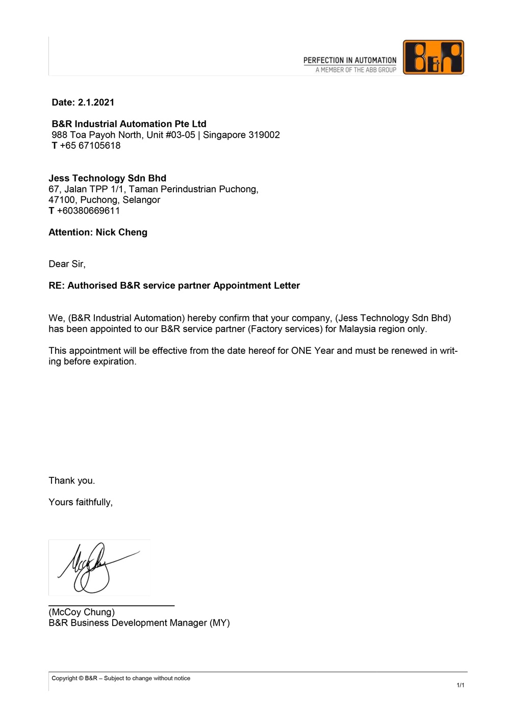 Authorised B&R service partner Appointment Letter
