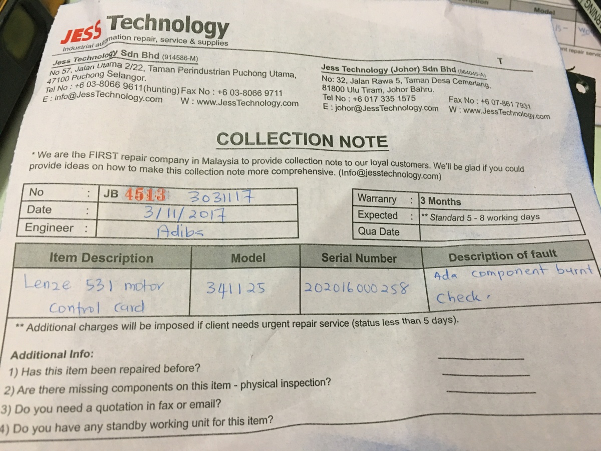 Repair LENZE 341125 LENZE 531 MOTOR CONTROL CARD in Malaysia, Singapore, Thailand, Indonesia